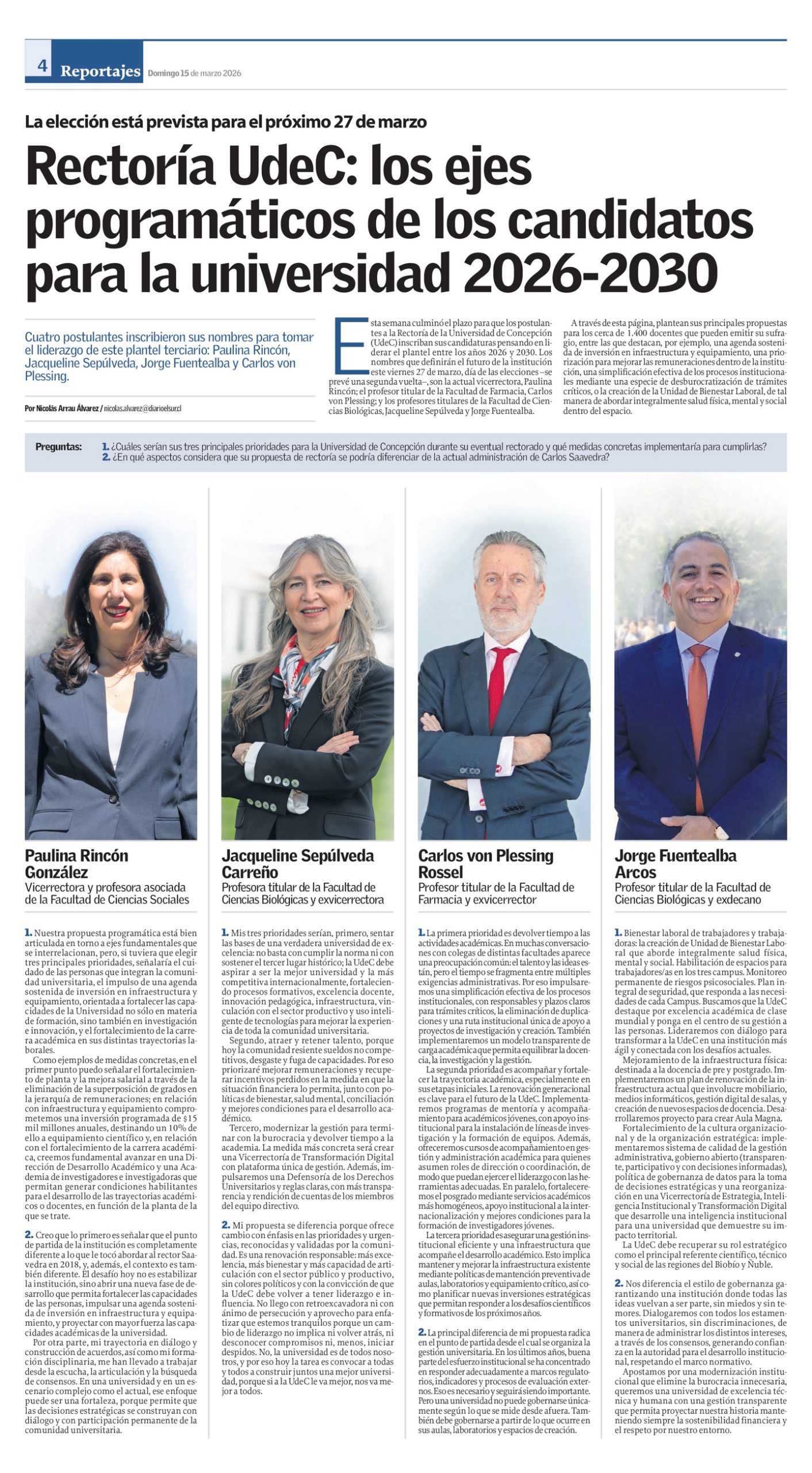 Hoy presentamos esta propuesta programática basada en un profundo compromiso con el rol ciudadano y público de nuestra Universidad. Tenemos la convicción del aporte significativo que supone para Chile y el mundo lo que día a día hacemos en la UdeC, tanto en nuestra contribución formativa como en investigación, creación, innovación y vinculación con el medio. Tras más de un siglo de historia, la Universidad de Concepción está llamada a aportar de manera decisiva a los desafíos de la humanidad: formando personas, generando conocimiento, creando, impulsando la innovación y contribuyendo, a través de todo ello, no solo a comprender el mundo actual, sino también a transformarlo.