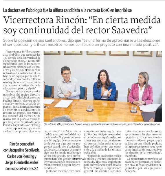 «Para el Campus Chillán es importante consolidar los avances que ha tenido en los últimos años en su Plan Maestro, Distrito de Innovación Tecnológica y Plan Estratégico del Campus. Para esta estructuración y modernización, es primordial seguir la línea cimentada en el transcurso de los años, por eso considero profundamente que Paulina Rincón es la mejor alternativa para la implementación y maduración de estas propuestas que vincularán más eficientemente a la Universidad de Concepción con la Comunidad Regional, Nacional e Internacional».
