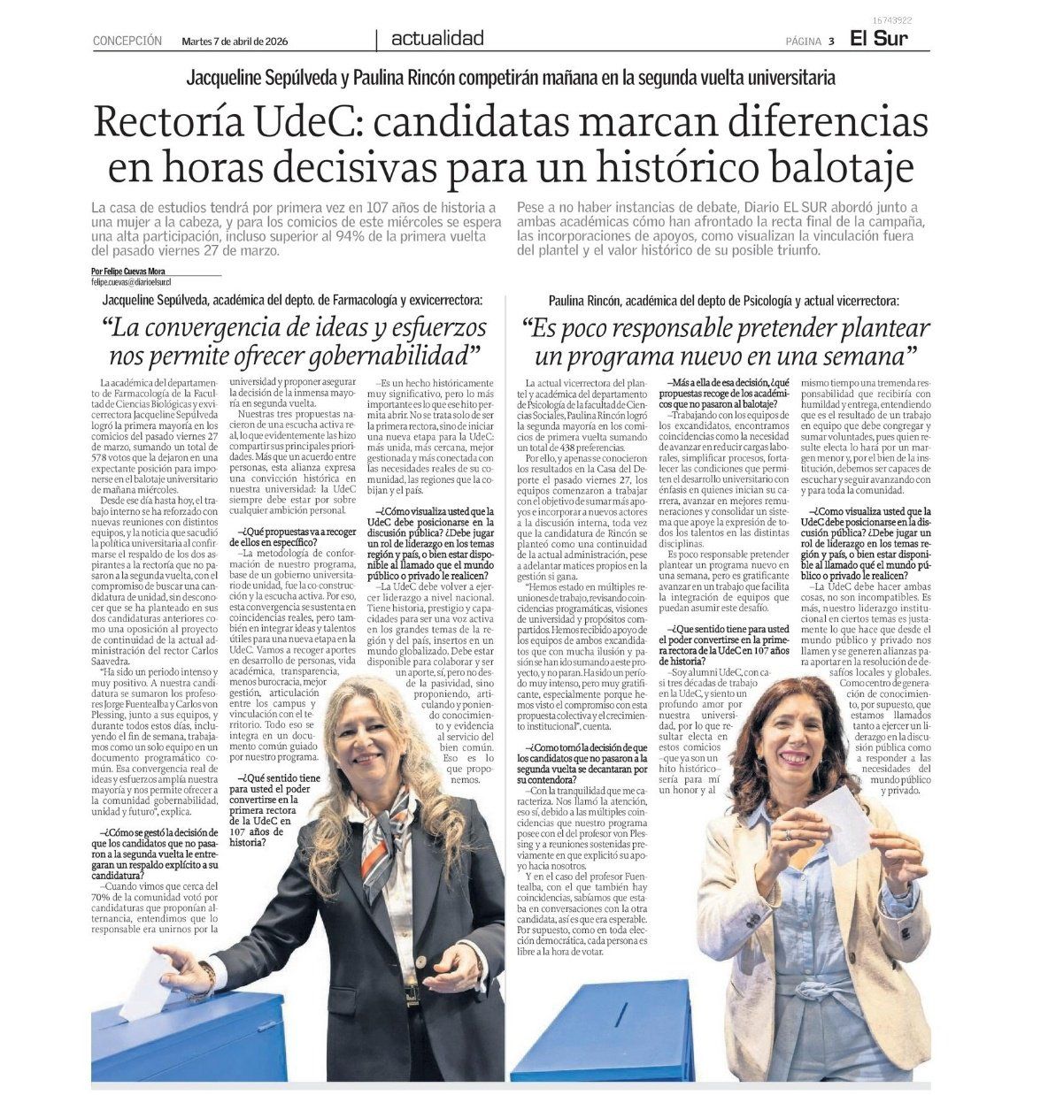 “Voy a apoyar el proyecto de rectoría de la Dra. Paulina Rincón porque combina cualidades académicas y humanas con la visión que la UdeC necesita para enfrentar sus desafíos, asegurando que la excelencia sea accesible para todas y todos, más allá de Santiago. Además, ha sido parte clave del equipo que permitió a la universidad superar años complejos. Invito a votar por la Dra. Paulina Rincón con la confianza que da una labor sólida y comprometida».
